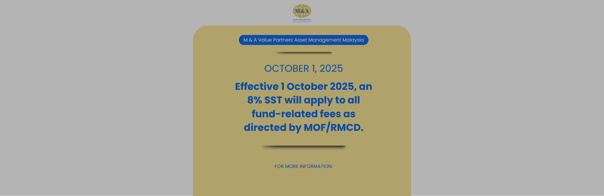 Please be informed that, effective 1 October 2025, an 8% Service Tax (SST) will be imposed on all fees and charges related to our fund (e.g. management fee, trustee fee, sales charge and other applicable charges), in line with the Ministry of Finance and Royal Malaysian Customs Department directives on the imposition of service tax on fee-based financial services.